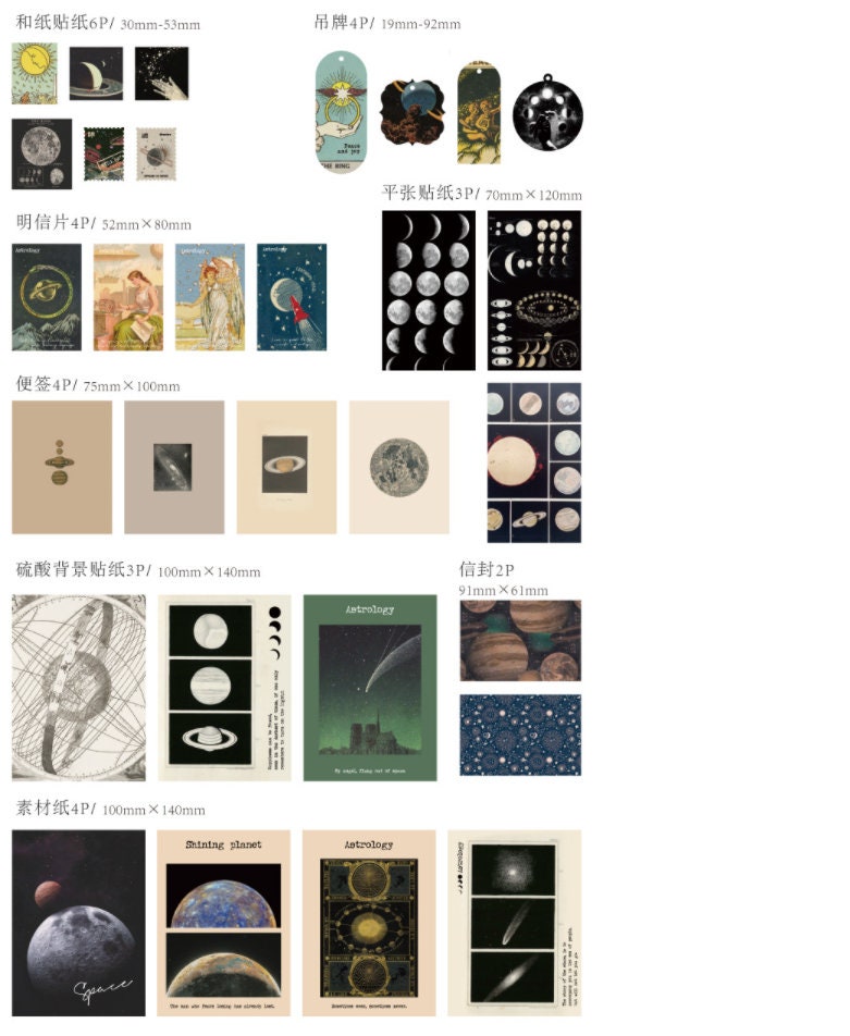 - stickers size: 30-53mm/4tags size:19-92mm 4 post cards :52*80mm/3